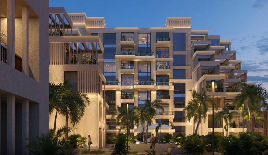 • Four low-rise structures (ground + 8 floors) arranged around a central courtyard oasis.